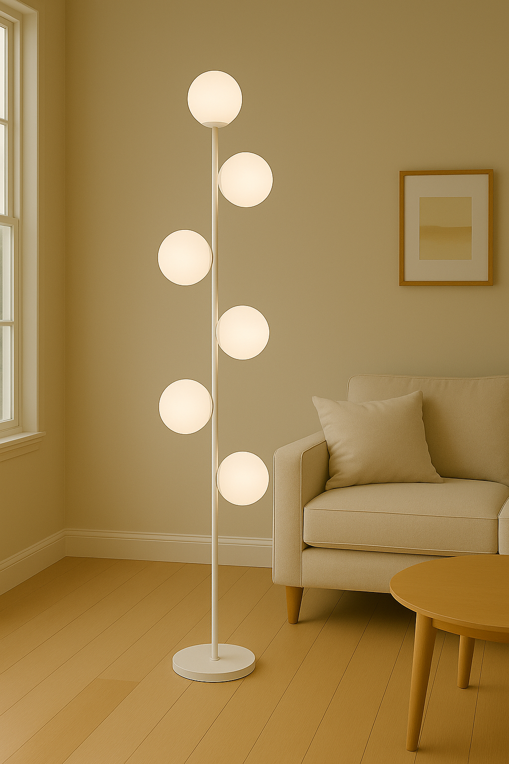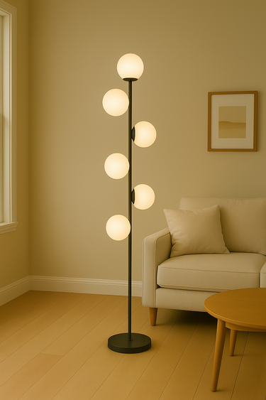 This modern globe floor lamp features five glowing spheres arranged in a sleek vertical design, adding a bold yet stylish touch to your decor. Ideal for living rooms, bedrooms, or corners, it creates a warm and inviting atmosphere. Its minimalist style pairs seamlessly with both modern and classic interiors.