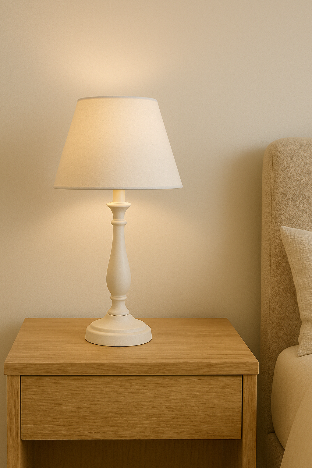 This classic bedside table lamp blends traditional design with modern style. Featuring a fabric shade and a sculpted base, it creates a warm glow ideal for reading or relaxing. Ideal for nightstands, living rooms, or home offices, it adds a timeless charm to any interior. It has Push-button switch + LED warm light bulb.