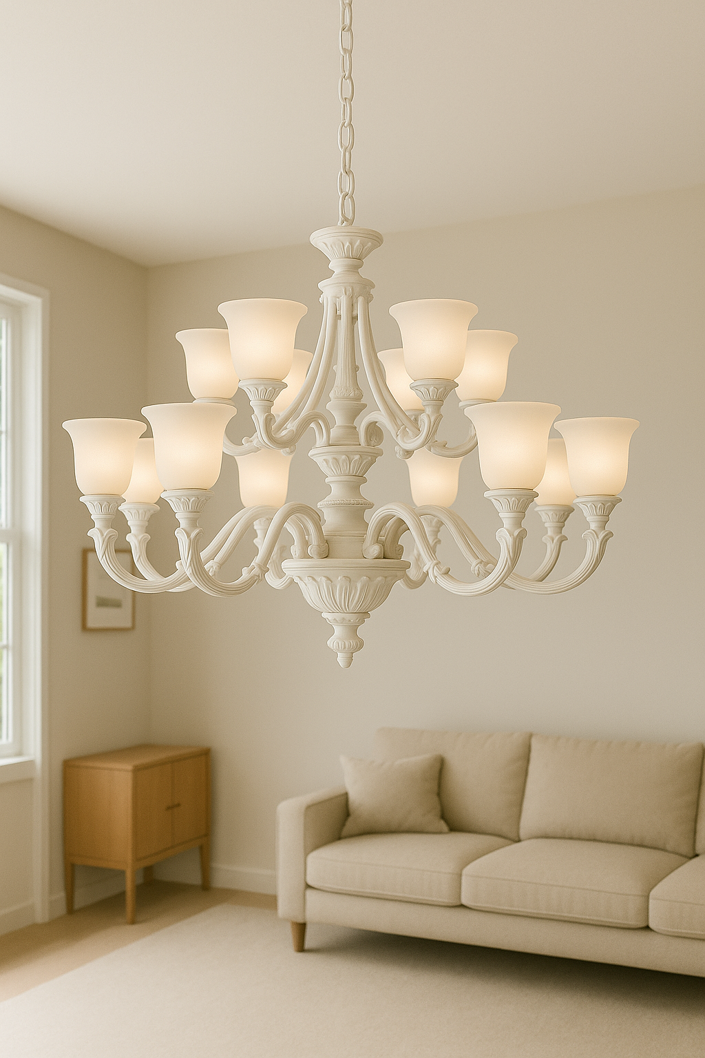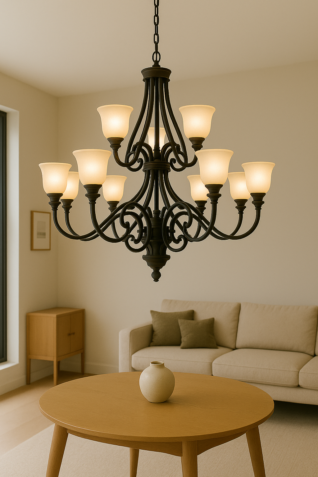 This modern chandelier features twelve frosted glass shades and intricate wrought-iron detailing, creating a bold statement piece for any home. Its heavy design radiates sophistication, while the warm glow adds style. Ideal for large living rooms, dining halls, or high-ceiling interiors, it combines luxury with timeless charm.